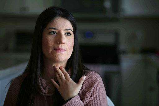 In this Feb. 6, 2018 photo, former Illinois State University student Maria Christiansen touches some of the remaining scars on her neck, at her home in Cortland, Ill., from when she was shot and nearly killed in a 2008 shooting at NIU Feb. 14, 2008. Christiansen recovered from her wounds and is now a police officer on the campus. Families affected by the shooting that killed five and injured 21 are remembering their loved ones 10 years later. On Wednesday, Feb. 14, 2018, parents, students, first responders, school officials and others are planning to gather in honor of the victims. (Brian Hill/Daily Herald, via AP) The Associated Press