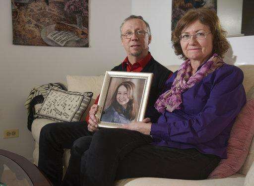 In this Jan. 31, 2018 photo, Joe and Laurel Dubowski hold a photo of their daughter Gayle at their home in Carol Stream, Ill. Gayle was killed 10 years ago during the Valentines Day shooting at Northern Illinois University. Families affected by the 2008 NIU shooting that killed five and injured 21 are remembering their loved ones 10 years later. On Wednesday, Feb. 14, 2018, parents, students, first responders, school officials and others are planning to gather in honor of the victims. (Mark Black/Daily Herald, via AP) The Associated Press