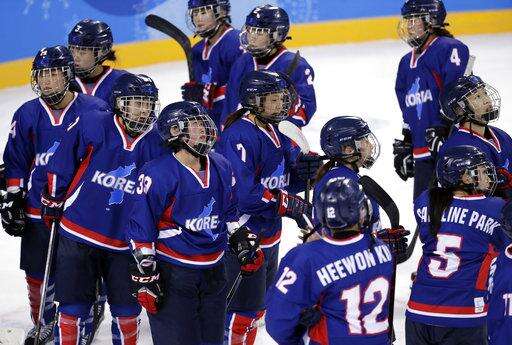 Players of the combined Koreas react after the preliminary round of the women's hockey game against Sweden at the 2018 Winter Olympics in Gangneung, South Korea, Monday, Feb. 12, 2018. Sweden won 8-0. (AP Photo/Julio Cortez)