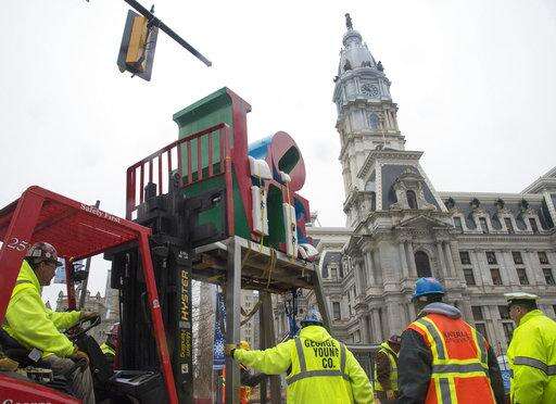 FILE - In this Feb. 23, 2016, file photo, workers temporarily relocate artist Robert Indiana's LOVE sculpture before the start of renovations to its traditional location in John F. Kennedy Plaza, also known as Love Park, to a temporary spot across the street in Dilworth Park west of City Hall in Philadelphia. The sculpture is set to return to its customary home Tuesday, Feb. 13, 2018, ahead of Valentine's Day. The tourist attraction has been repainted to its original colors and will be installed on a new rectangular pedestal, in keeping with how Indiana's other works are displayed. (Clem Murray/The Philadelphia Inquirer via AP, File)
