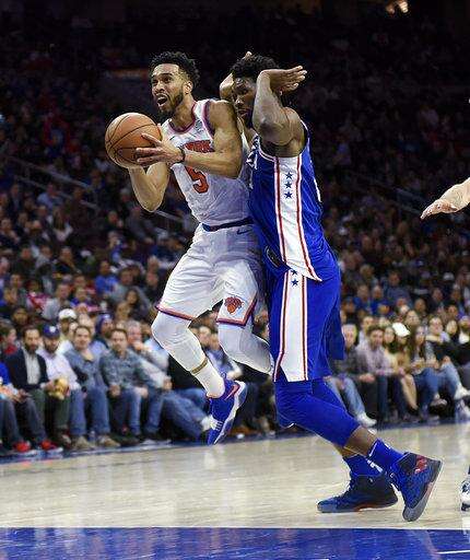 New York Knicks' Courtney Lee (5) draws a foul from Philadelphia 76ers' Joel Embiid (21) in the first half of an NBA basketball game, Monday, Feb 12, 2018, in Philadelphia. (AP Photo/Michael Perez) The Associated Press