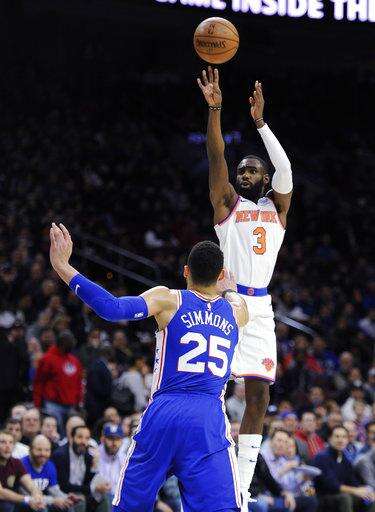 New York Knicks' Tim Hardaway Jr. (3) takes a jump shot over Philadelphia 76ers' Ben Simmons (25) in the first half of an NBA basketball game, Monday, Feb 12, 2018, in Philadelphia. (AP Photo/Michael Perez) The Associated Press