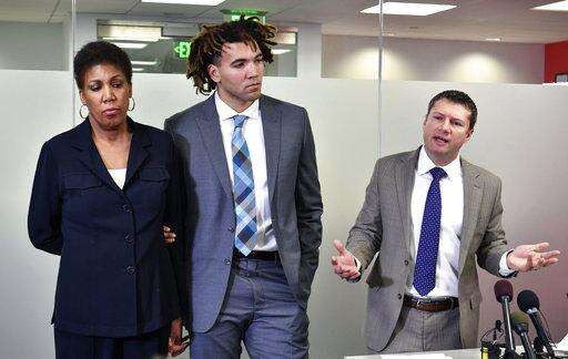 Flanked by his lawyer and mother, the senior center appeared at a news conference rather than as scheduled before a student panel on sexual misconduct. His mother, Marlene Lynch, said she believed him "100 percent."