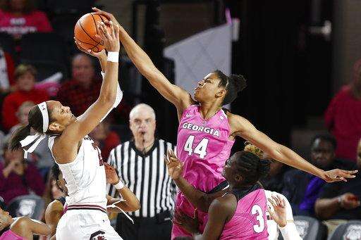 Georgia forward Malury Bates (44) blocks a shot from South Carolina forward A'ja Wilson during an NCAA college basketball game in Athens, Ga., Thursday, Feb. 15, 2018. (Joshua L. Jones/Athens Banner-Herald via AP) The Associated Press