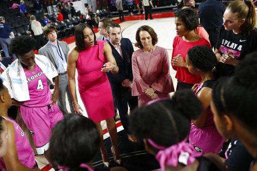 Georgia coach Joni Taylor speaks with her team after a loss to South Carolina in an NCAA college basketball game Thursday, Feb. 15, 2018, in Athens, Ga. (Joshua L. Jones/Athens Banner-Herald via AP) The Associated Press