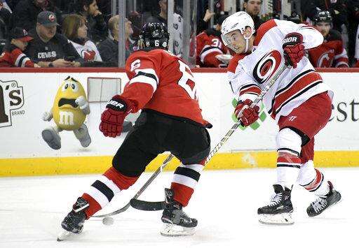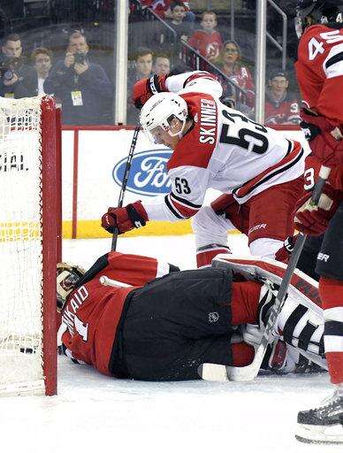 NOTES: Devils LW Taylor Hall stretched his personal point-scoring streak to 16 games with an assist on Hischier's goal. ... New Jersey is now 21-0-2 when leading after two periods. ... Zajac played in his 819th game with the Devils, tying him with Jay Pandolfo for sixth most among skaters in team history. ... Skinner now has 199 career goals and moved past Jeff O'Neill for fifth place on Carolina's all-time goals list. ... Devils C Brian Boyle missed his second straight game with a shoulder injury. ... Palmieri played in his 200th game for the Devils. ... The win was 29th for New Jersey, exceeding its total of last season.