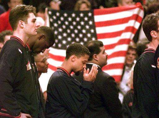 FILE - In this March 15, 1996, file photo, Denver Nuggets guard Mahmoud Abdul-Rauf stands with his teammates and prays during the national anthem before the game with the Chicago Bulls in Chicago. During the 1995-96 season, Abdul-Rauf began stretching or staying in the locker room during the national anthem. He was suspended for one game. But at season’s end, despite averaging 19.2 points and 6.8 assists, he was traded from the Nuggets to the Sacramento Kings. And when his contract expired two years later, he couldn’t get a tryout and was out of the league at age 29. (AP Photo/Michael S. Green, File) The Associated Press