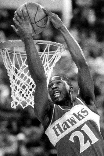 FILE - In this Feb. 9, 1985, file photo, Atlanta Hawks forward Dominique Wilkins dunks the ball over his head during the NBA Slam Dunk Contest in Indianapolis. Wilkins, an NBA Hall of Famer nicknamed The Human Highlight Film for his thunderous, acrobatic dunks during the 1980s and ‘90s, believes social media have amplified athletes’ voices, and the Twitter-less past did not offer sports stars the soap boxes they have now. (AP Photo/Doug Atkins, File) The Associated Press