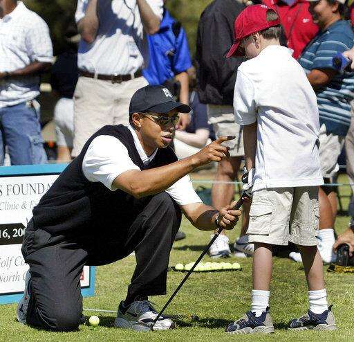 FILE - In this April 16, 2004, file photo, Tiger Woods, left, helps Damon Eames, 8, with his swing during a golf clinic at Stryker Golf Course at Fort Bragg, N.C. Michael Jordan and other iconic athletes of the 1980s and 90s established the power of individual sports brands, a transitional platform, according to Mike Glenn, a 10-year NBA veteran who played from 1977-87 and member of the National Basketball Retired Players Association board of directors, believes athletes benefit from today. (AP Photo/Chuck Burton, File) The Associated Press