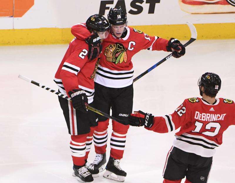 Chicago Blackhawks defenseman Duncan Keith (2) celebrates his goal against the Anaheim Ducks with center Jonathan Toews (19) and right wing Alex DeBrincat during the second period of Thursday's game at the United Center. Associated Press