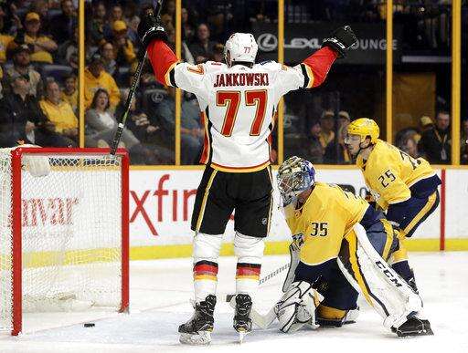 Calgary Flames center Mark Jankowski (77) celebrates after scoring a goal against Nashville Predators goalie Pekka Rinne (35), of Finland, in the third period of an NHL hockey game Thursday, Feb. 15, 2018, in Nashville, Tenn. (AP Photo/Mark Humphrey) The Associated Press