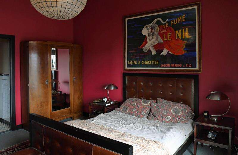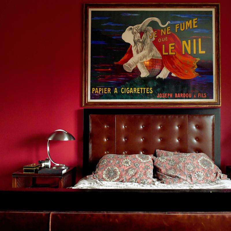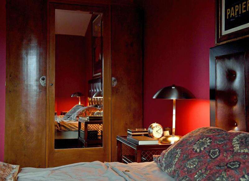 The designers were faced with a room about 18 by 13 feet, with an 8-foot ceiling at the windows that rises to 14 feet by the bedroom doors. Walls are a medium-dark red, with brown trim so dark it appears black. Large bi-fold closet doors eat up one wall, an art deco armoire fills another, and there is just room for a queen bed and bed stands on the long wall opposite the closet. It would be a challenge.