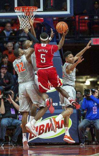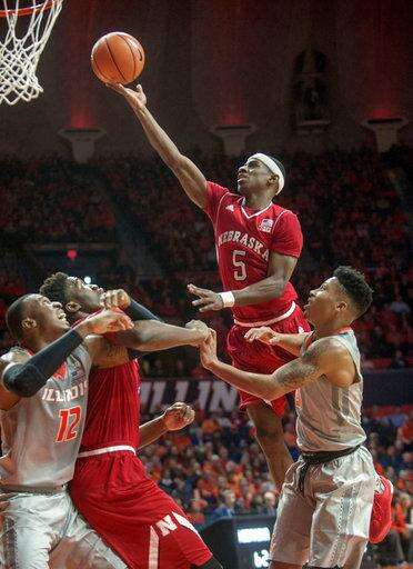 Nebraska guard Glynn Watson Jr. (5) goes up to shoot near Illinois forward Leron Black (12), guard Aaron Jordan (23) and guard Te'Jon Lucas (3) during the first half of an NCAA college basketball game in Champaign, Ill., Sunday, Feb. 18, 2018. (AP Photo/Rick Danzl) The Associated Press