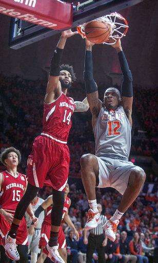 Illinois forward Leron Black (12) dunks near Nebraska forward Isaac Copeland (14) during the first half of an NCAA college basketball game in Champaign, Ill., on Sunday, Feb.18, 2018. (AP Photo/Rick Danzl) The Associated Press