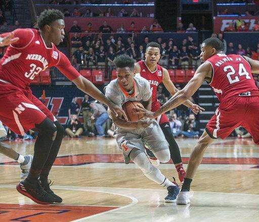 Illinois guard Trent Frazier (1) drives between Nebraska center Jordy Tshimanga (32), Nebraska guard Evan Taylor (11) and Nebraska guard James Palmer Jr. (24) during the first half of an NCAA college basketball game in Champaign, Ill., on Sunday, Feb.18, 2018. (AP Photo/Rick Danzl) The Associated Press