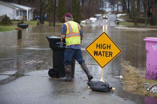 A St. Joseph County Highway departartment worker places a recycling bin on a street in South Bend, Ind., Tuesday, Feb. 20, 2018. A storm system stretched from Texas to the Great Lakes states and forced some schools to close. The National Weather Service issued winter weather advisories for parts of Oklahoma, Kansas, North Dakota, Missouri, Iowa, Minnesota and Wisconsin. Flood warnings were in effect in Illinois, Indiana and Michigan with flood watches in Texas and Arkansas. (Santiago Flores/South Bend Tribune via AP) The Associated Press