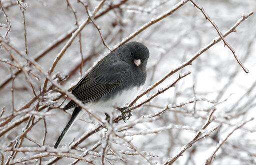 A Slate-Colored Junco perches among icy branches in Lawrence, Kan., Tuesday, Feb. 20, 2018. The area is under a winter weather advisory. (AP Photo/Orlin Wagner) The Associated Press