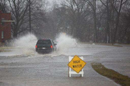 The driver of a car wades through an overflowing street in South Bend, Ind., Tuesday, Feb. 20, 2018. A storm system stretched from Texas to the Great Lakes states and forced some schools to close. The National Weather Service issued winter weather advisories for parts of Oklahoma, Kansas, North Dakota, Missouri, Iowa, Minnesota and Wisconsin. Flood warnings were in effect in Illinois, Indiana and Michigan with flood watches in Texas and Arkansas. (Santiago Flores/South Bend Tribune via AP) The Associated Press