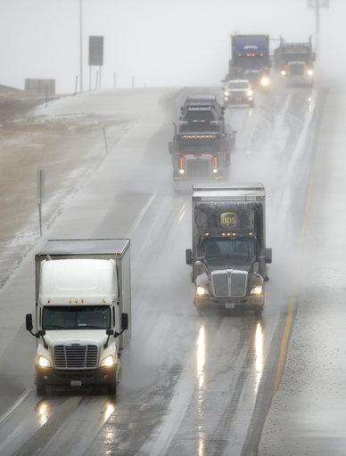 Traffic moves westbound along an icy I-70 near Lawrence, Kan., Tuesday, Feb. 20, 2018. The area is under a winter weather advisory. (AP Photo/Orlin Wagner) The Associated Press