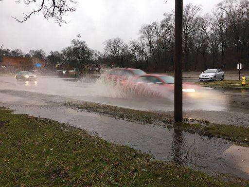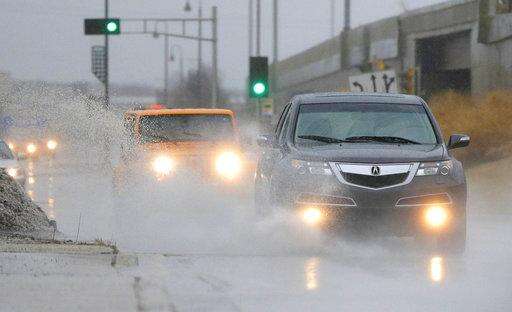Vehicles travel through standing water on a street in Glendale, Wis., Tuesday, Feb. 20, 2018. A storm system stretched from Texas to the Great Lakes states and forced some schools to close. The National Weather Service issued winter weather advisories for parts of Oklahoma, Kansas, North Dakota, Missouri, Iowa, Minnesota and Wisconsin. Flood warnings were in effect in Illinois, Indiana and Michigan with flood watches in Texas and Arkansas. (Mike De Sisti/Milwaukee Journal-Sentinel via AP) The Associated Press