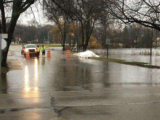 Workers block off a side road near Park Street in Kalamazoo Tuesday, Feb. 20, 2018 due to flooding. Heavy rain and melting snow are combining to cause flooding and road closures in parts of Michigan's Lower Peninsula.(Meagan Beck/Kalamazoo Gazette-MLive Media Group via AP) The Associated Press