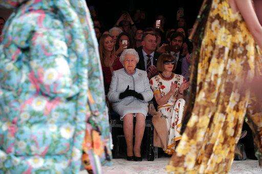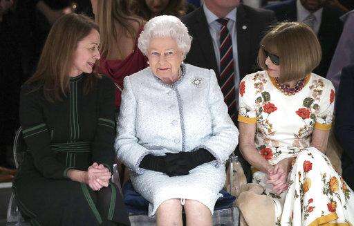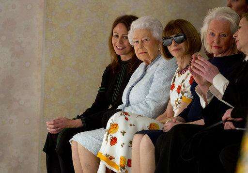 Britain's Queen Elizabeth sits next to fashion editor Anna Wintour, right, and Caroline Rush, chief executive of the British Fashion Council (BFC) as they view Richard Quinn's runway show before presenting him with the inaugural Queen Elizabeth II Award for British Design, as she visits London Fashion Week's BFC Show Space in central London, Tuesday, Feb. 20, 2018. (Yui Mok/Pool photo via AP)