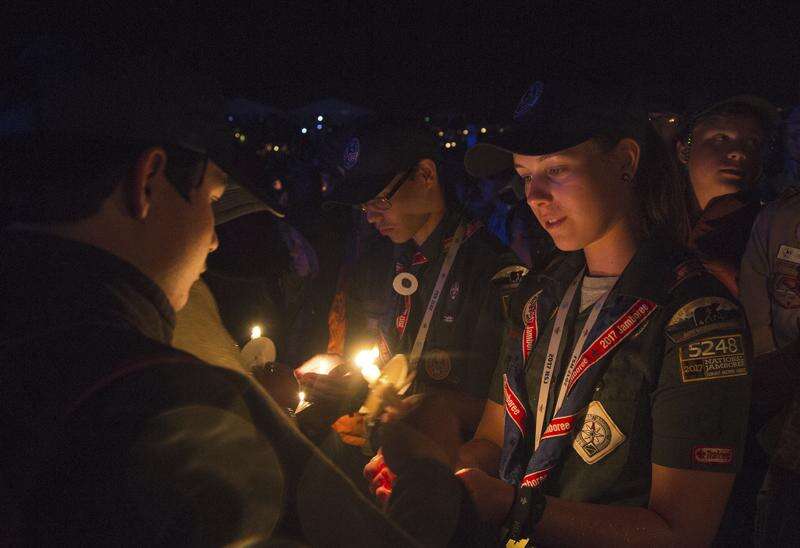 Venture Scout Hannah Bare, center, earned the Summit Award of Great Smoky Mountain Council during the Farewell Show of the 2017 National Scout Jamboree. Tom Copeland/Boy Scouts of America via AP