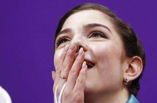 Evgenia Medvedeva of the Olympic Athletes of Russia reacts as her scores are posted following her performance in the women's short program figure skating in the Gangneung Ice Arena at the 2018 Winter Olympics in Gangneung, South Korea, Wednesday, Feb. 21, 2018. (AP Photo/Bernat Armangue) The Associated Press