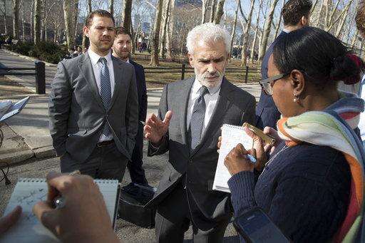 Tennis star Eugenie Bouchard's attorney Benedict Morelli speaks to reporters outside Brooklyn Federal court, Wednesday, Feb. 21, 2018, in New York. Bouchard testified during her negligence lawsuit against the United States Tennis Association that a wet floor caused her to slip and fall inside a locker room at the 2015 U.S. Open. (AP Photo/Mary Altaffer) The Associated Press