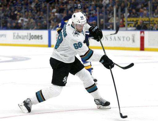 San Jose Sharks' Melker Karlsson (68) shoots the puck during the first period of an NHL hockey game against the St. Louis Blues, Tuesday, Feb. 20, 2018, in St. Louis.(AP Photo/Tom Gannam) The Associated Press