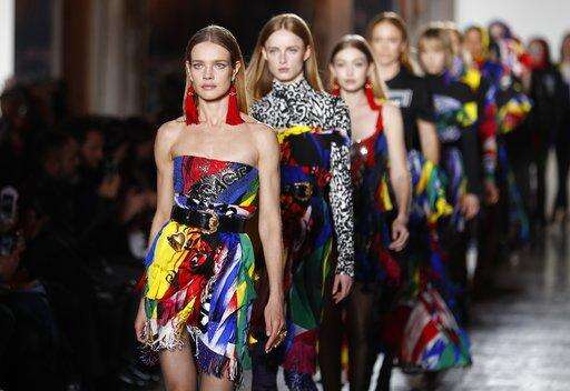 Models wear creations as part of the Versace women's Fall/Winter 2018-2019 collection, presented during the Milan Fashion Week, in Milan, Italy, Friday, Feb. 23, 2018. (AP Photo/Antonio Calanni)