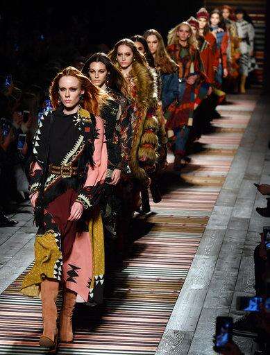 Models wear creations part of the Etro women's Fall/Winter 2018-2019 collection, presented during the Milan Fashion Week, in Milan, Italy, Friday, Feb. 23, 2018. (Daniel Dal Zennaro/ANSA via AP)