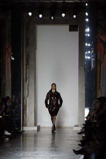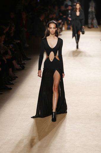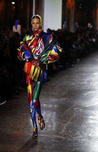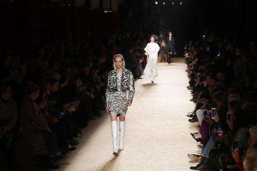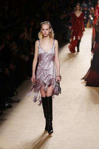 A model wears a creation as part of the Roberto Cavalli women's Fall/Winter 2018-2019 collection, presented during the Milan Fashion Week, in Milan, Italy, Friday, Feb. 23, 2018. (AP Photo/Antonio Calanni)