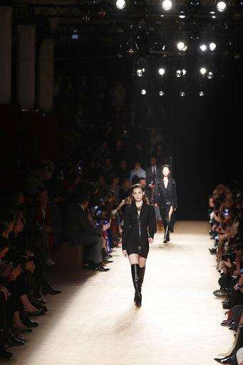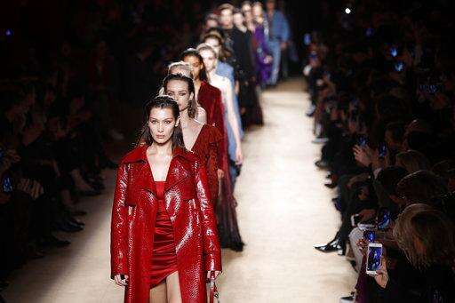 Model Bella Hadid, front, leads other models as they wear creations as part of the Roberto Cavalli women's Fall/Winter 2018-2019 collection, presented during the Milan Fashion Week, in Milan, Italy, Friday, Feb. 23, 2018. (AP Photo/Antonio Calanni)