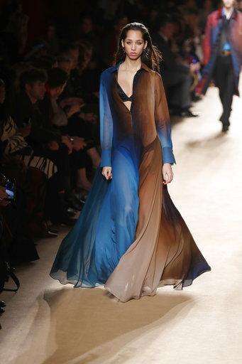 On the men's side, a skin-tight top in an ethereal blue that bleeds into darkness seemed inspired by the creature in the Oscar-nominated film "The Shape of Water."