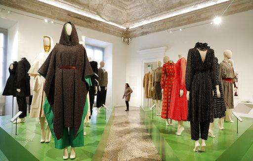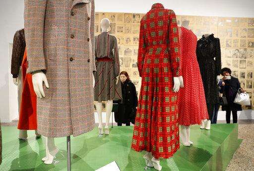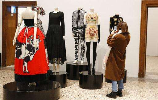 A woman takes pictures to designer clothes displayed at the exhibit "Italiana, Italy seen from fashion", an exposition that aims to show the evolution of Italy, its culture and its people through fashion from 1971 to 2001, unveiled in Milan, Italy, Thursday, Feb. 22, 2018. (AP Photo/Antonio Calanni)