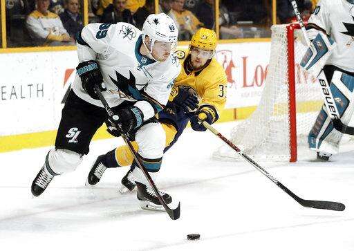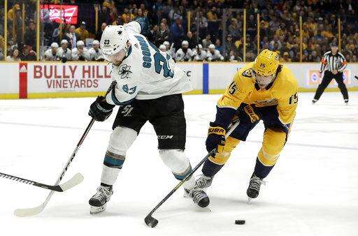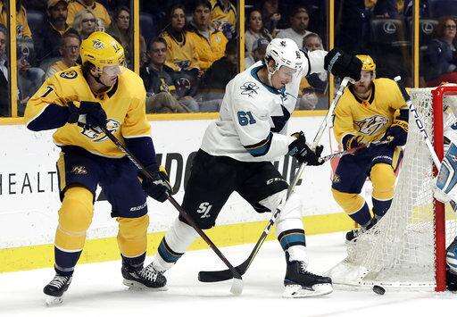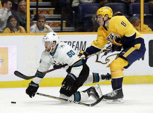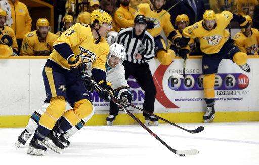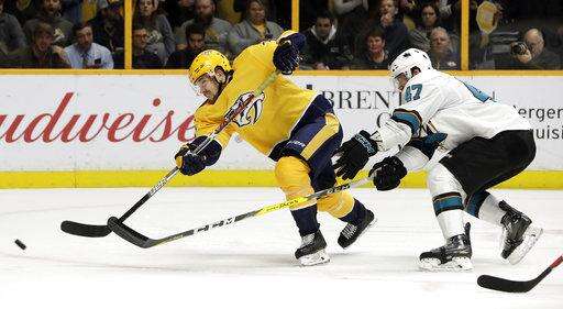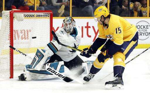 Josi's shot from the left point hit traffic in front and Bonino beat Sharks defenseman Dylan DeMelo to the puck near the left post. Bonino took it around the net and beat goalie Aaron Dell to the right post with a wraparound for his ninth of the season.