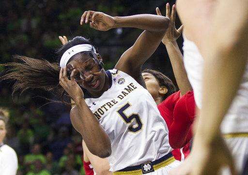 Notre Dame's Jackie Young (5) grabs for her facemask after being hit in the face during the first half of an NCAA college basketball game against NC State Sunday, Feb. 25, 2018, in South Bend, Ind. (AP Photo/Robert Franklin) The Associated Press