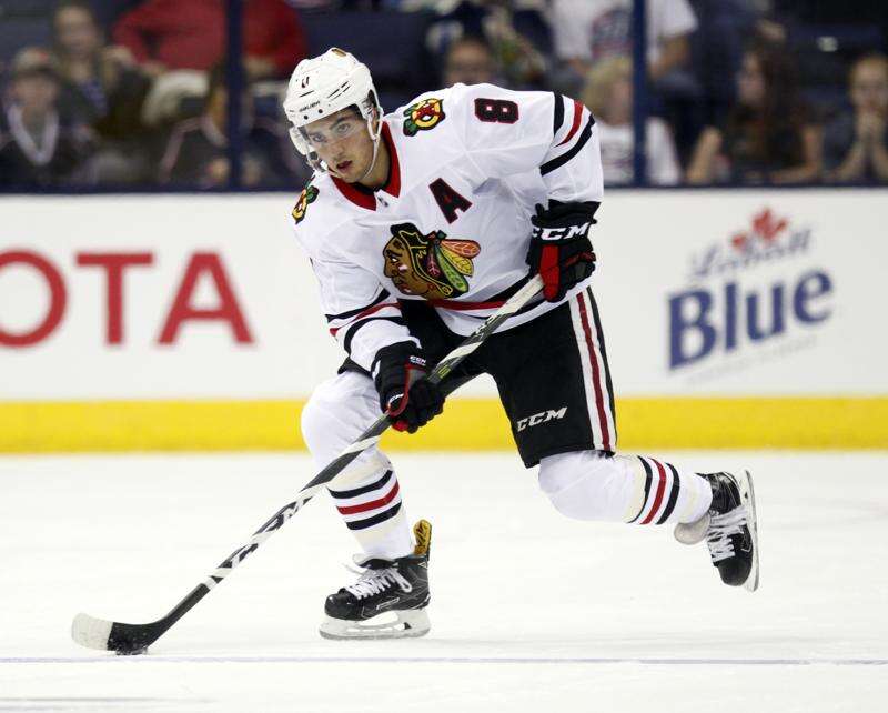 Chicago Blackhawks' Hinostroza reacts to Hartman trade