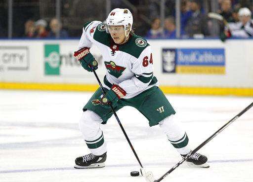 Minnesota Wild right wing Mikael Granlund (64) maneuvers the puck during the third period of an NHL hockey game against the Minnesota Wild in New York, Friday, Feb. 23, 2018. (AP Photo/Kathy Willens) The Associated Press