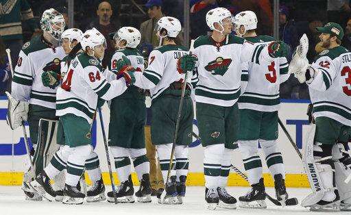 Minnesota Wild goaltender Devan Dubnyk, left, and Wild right wing Mikael Granlund, third from left, celebrate with teammates after they defeated the New York Rangers in an NHL hockey game in New York, Friday, Feb. 23, 2018. (AP Photo/Kathy Willens) The Associated Press