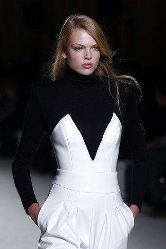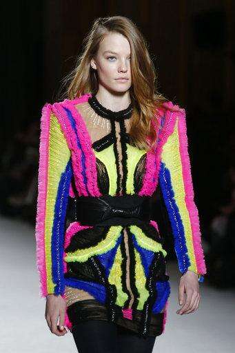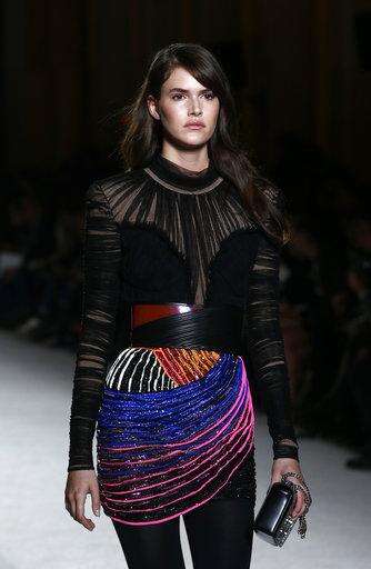 A model wears a creation for Balmain's ready-to-wear fall-winter 2018/2019 fashion collection presented in Paris, Friday, March 2, 2018. (AP Photo/Thibault Camus)