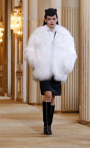 A winter wonder-wardrobe kicked off the collection with furry, snow-kissed all-white ensembles. The featured knits in the house's famed steam-stretch fabric showed subtle wavy lines.