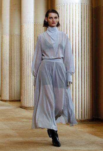 Rousteing is a showman and no detail goes unmissed - including incorporating the dazzling spirit of the storied City Hall into the shimmering clothes. One of the first looks - a loose silvery top and sheer, sheeny cropped pants - sported teardrop paillettes that mirrored the hall's 15 large crystal chandeliers.