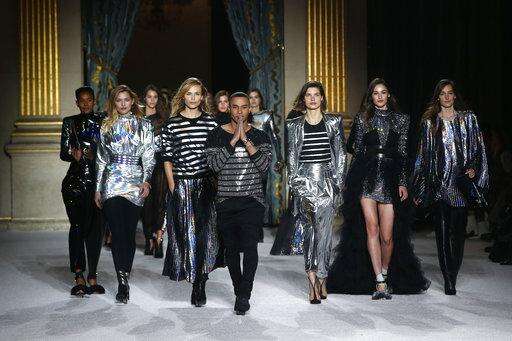 French fashion designer Olivier Rousteing walks with models after the presentation of Balmain's ready-to-wear fall-winter 2018/2019 fashion collection presented in Paris, Friday, March 2, 2018. (AP Photo/Thibault Camus)