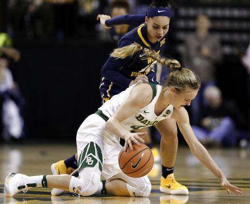 Baylor guard Kristy Wallace (4), of Australia, retains control of the ball after slipping on the court floor as West Virginia guard Chania Ray (12) defends in the first half of an NCAA college basketball game Monday, Feb. 26, 2018, in Waco, Texas. (AP Photo/Tony Gutierrez)