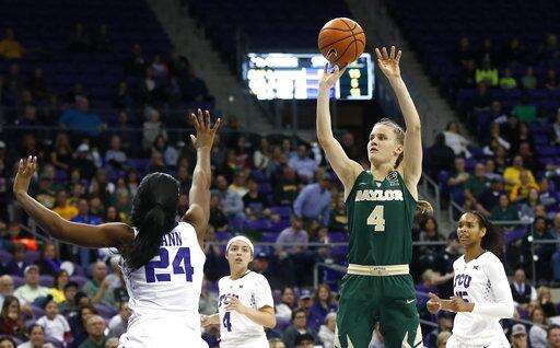 Baylor guard Kristy Wallace (4) shoots over TCU forward Dakota Vann (24) during the first half of an NCAA college basketball game, Saturday, Feb. 24, 2018, in Fort Worth, Texas. (AP Photo/Ron Jenkins)