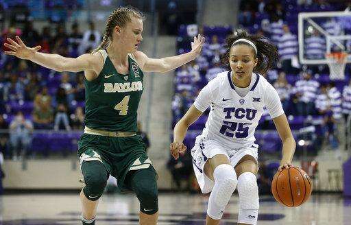 Baylor guard Kristy Wallace (4) defends as TCU guard Kianna Ray (25) brings the ball upcourt during the second half of an NCAA college basketball game, Saturday, Feb. 24, 2018, in Fort Worth, Texas. (AP Photo/Ron Jenkins)