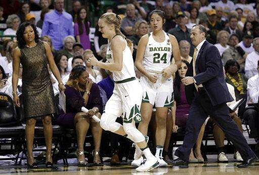 The Baylor coaching staff and Natalie Chou (24) watch as guard Kristy Wallace (4), of Australia, hops off the court with an unknown leg injury in the first half of an NCAA college basketball game against West Virginia on Monday, Feb. 26, 2018, in Waco, Texas. (AP Photo/Tony Gutierrez)