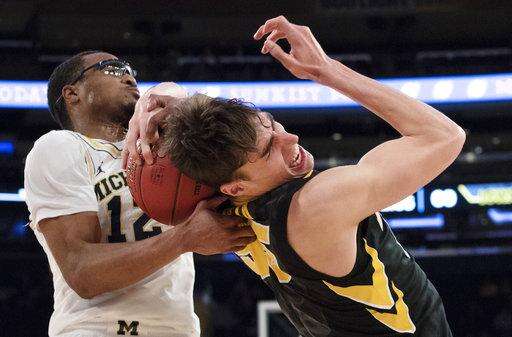 Michigan guard Muhammad-Ali Abdur-Rahkman (12) and Iowa forward Luka Garza (55) fight for a rebound during overtime of an NCAA college basketball game in the second round of the Big Ten conference tournament, Thursday, March 1, 2018, at Madison Square Garden in New York. Michigan won 77-71 in overtime. (AP Photo/Mary Altaffer) The Associated Press